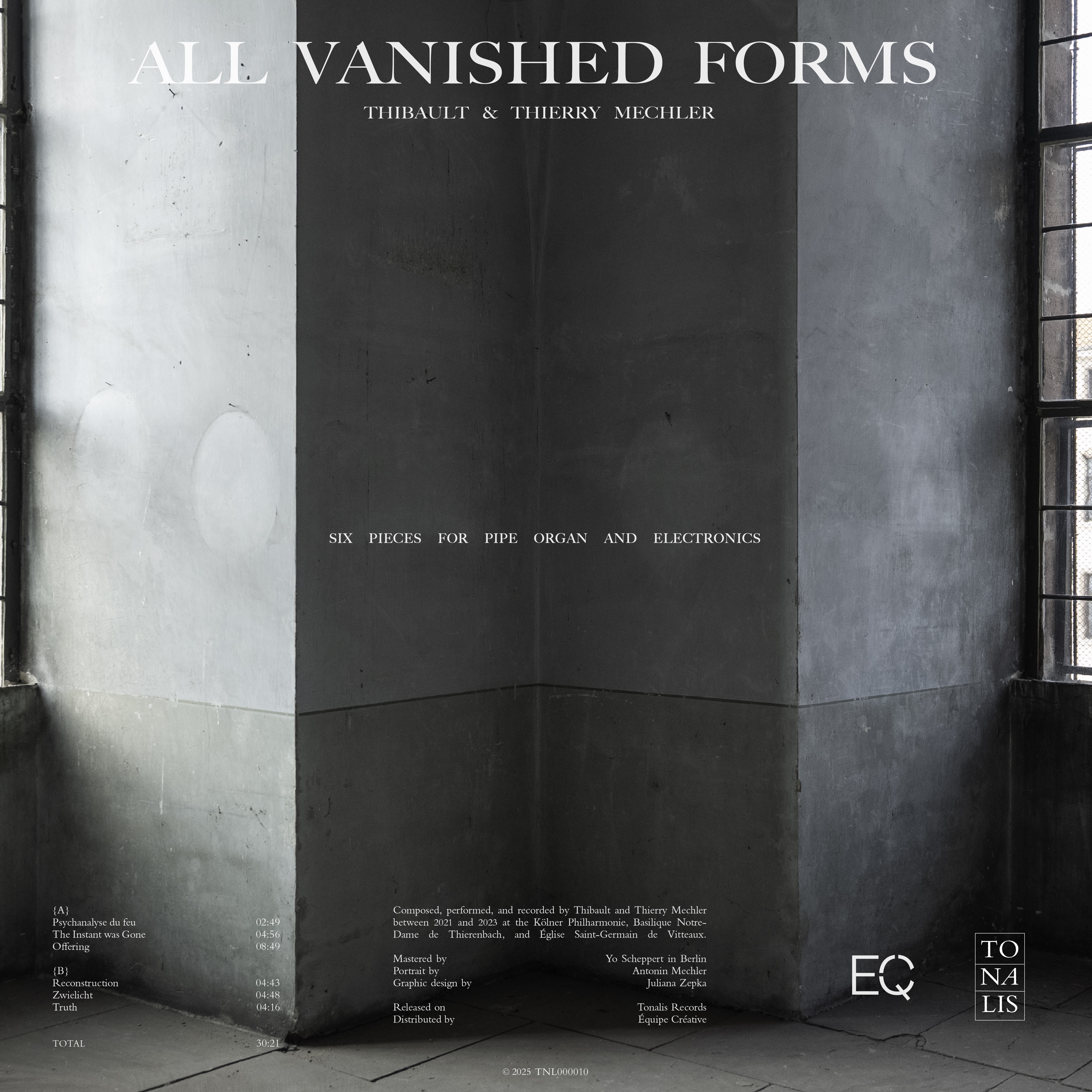 All Vanished Forms signs a father and son first collaboration. It introduces six pieces for pipe organ and electronic instruments written and composed by Thibault & Thierry Mechler.